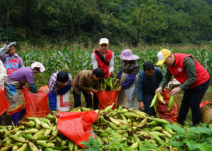 志愿者和農(nóng)民們一起裝收玉米