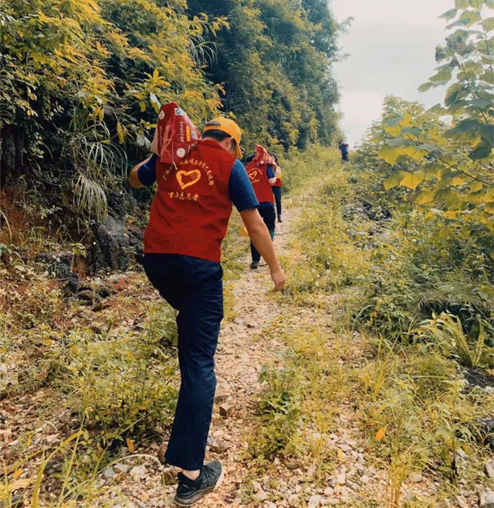 圖5:志愿者扛著慰問品步行到貧困學(xué)子家里